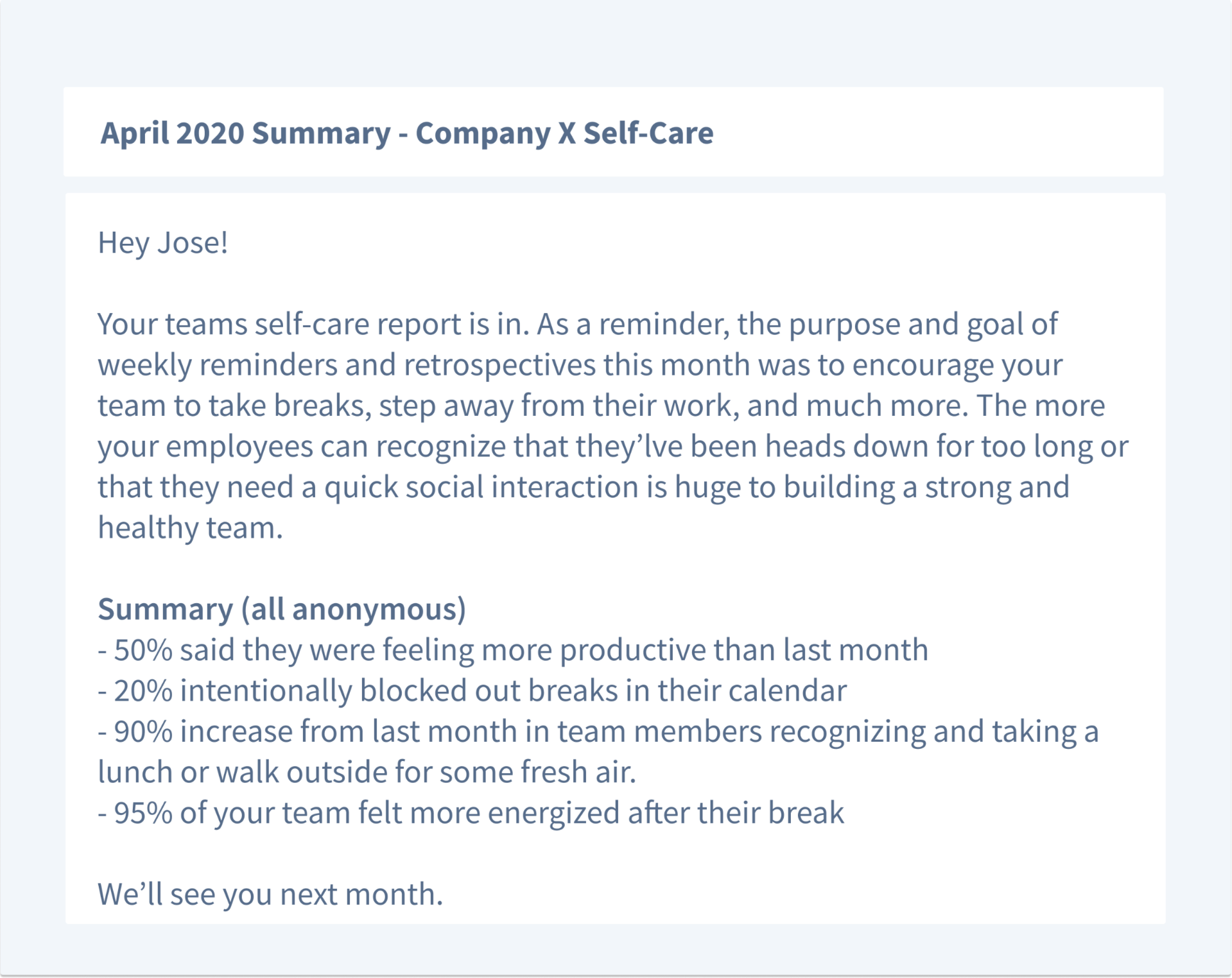 At the end of each month your team will take 1 survey taking a pulse on how this past month of reminders and check-ins helped them take more breaks and how that is helping them overall day to day