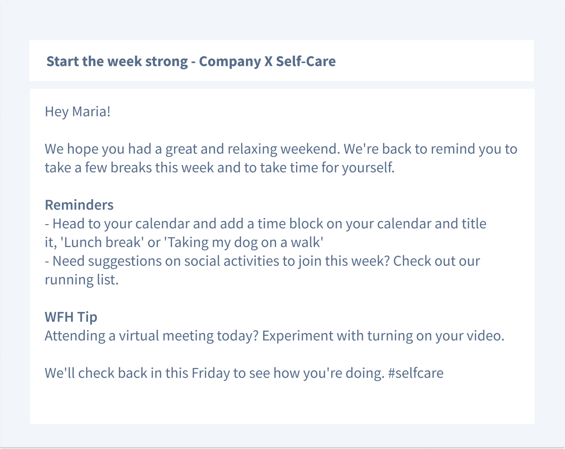 Every Monday morning your team will receive an email reminder to cut out time for a mental or social break as well as a WFH tip. We expect leaders to reinforce this within the company as well.