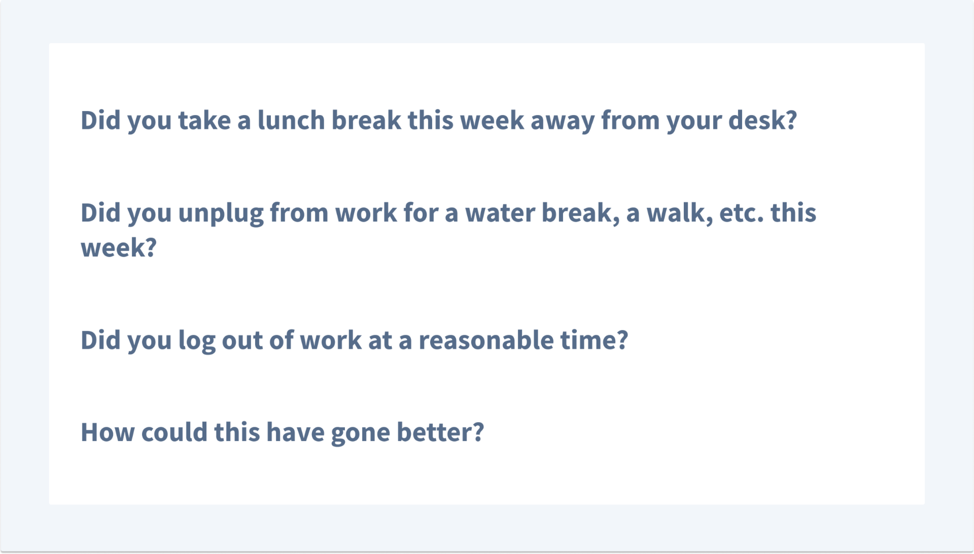 Reflection is everything. Your team can think back, reflect, and report on how their week played out in terms of self-care.We don't hold onto this data but instead ask your team to reflect and record on their own time.